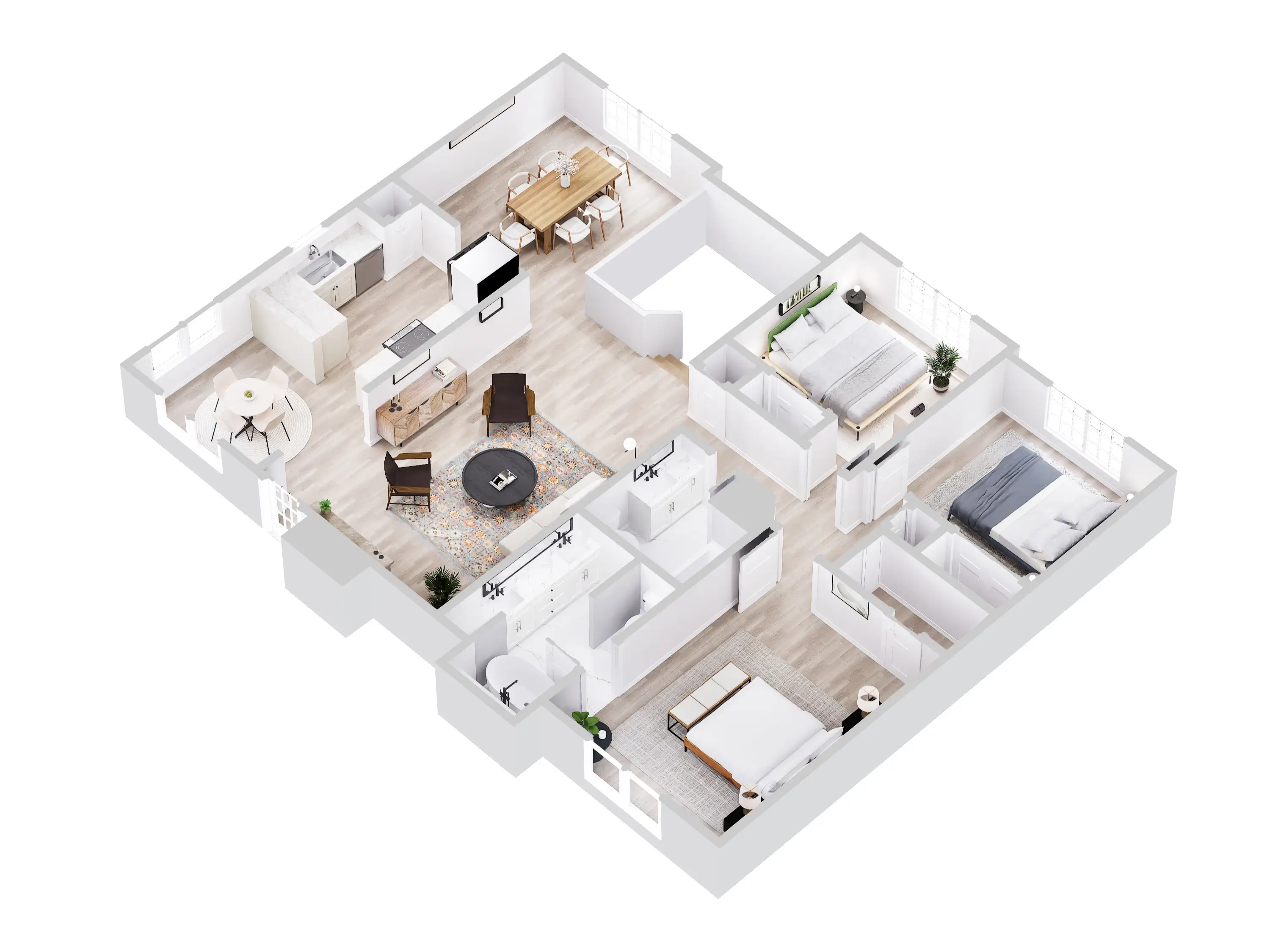 A professionally staged, 3D-rendered floor plan that helps buyers instantly connect with the home’s layout and style.
